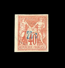 439 O 2 image#2, 1889 "25c" Blue surcharge on 40c Red on straw, used, four full to large margins, rich color, light blue cancel, small thin spot, very fine appearance; a scarce stamp; signed Miro, Brun, and accompanied by a 2001 APS certificate (Yvert #7; FF 11,000). (Image) 950.00