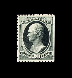 105 og 176 image#176, 30c Greenish black special printing, without gum as issued, a remarkably attractive example of this rare special printing, being wonderfully well centered, intense color and prooflike impression, scissors separated as the vast majority are found leaving full perforations except at right, and even so, much more complete than most the approximately 45 to 50 examples that are thought to yet exist of the Thirty Cent Hard Paper Special Printing, extremely fine; 1950 and 1999 PF certificates. (Image) 12,000.00