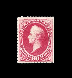 115 og 202 image#202, 90c Dull carmine special printing, without gum as issued, fresh example of this very rare stamp, centered a bit to right as virtually all known copies are, straight-edge at top, strong distinctive color on bright paper, nearly very fine; it is believed that less than 40 examples exist of the Ninety Cent Soft Paper Special Printing; signed Klein and accompanied by 1973 PF certificate. (Image) 25,000.00