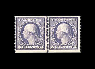 161 og 456 image#456, 3c Violet rotary coil, Ty. I, perf. 10 vert., joint line pair of this elusive coil, deep bright color with a particularly clear impression, well centered, o.g., lightly hinged, minute natural inclusion speck in the left stamp, fine-very fine; clear 1979 PF certificate. (Image) 1,250.00