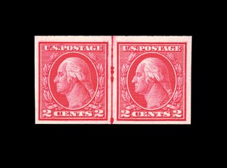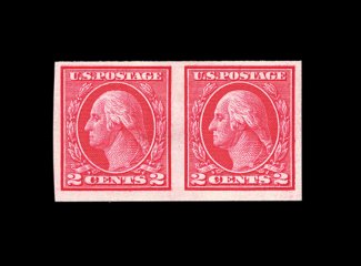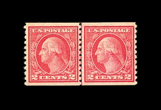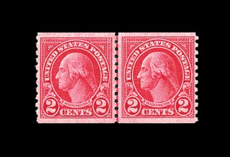 163 nh 459 image#459, 2c Carmine imperforate coil, joint line pair, large to very large margins, brilliantly fresh and crisp, light crease along frame of right stamp as is usual, o.g., n.h., very fine. (Image) 1,600.00