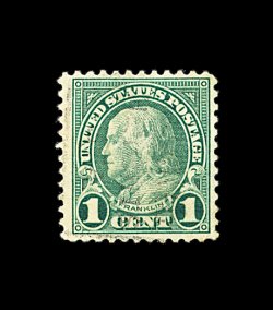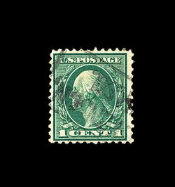 172 O 594 image#594, 1c Green coil waste, one of the most impressive appearing used examples of this exceedingly rare 20th century stamp that we have had the pleasure to offer, possessing outstanding centering within large to huge margins that are totally uncharacteristic for this stamp, the vast majority having considerably smaller margins and usually touching or cutting into the design on one or more sides (the Scott value is for perforations just touching on one side), surrounded by full even perforations, sumptuous bright color and detailed impression, and to complete the stunning aspect of this stamp is a black cancel that is so light that at first glance the stamp appears unused, accompanying certificate mentions several small flaws, most of which are quite minor, including a corner crease at top left, but none detract from this stamp's tremendous extremely fine gem appearance; it is doubtful that one could find another example of this stamp, sound or otherwise, that would equal the striking visage of the stamp offered here; 1999 PF certificate. (Image) 6,750.00