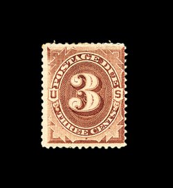 179 og J10 image#J10, 3c Deep brown special printing, mint example of the most elusive value of all the Postage Due Special Printings, deep color and detailed sharp impression, both characteristic of this issue, centered to right with perfs. barely touching as is frequently the case on this value, slightly disturbed o.g., small gum covered thin spot, otherwise fine; only 436 stamps were issued, but only a tiny fraction of these still survive; 1998 PF certificate. (Image) 14,000.00