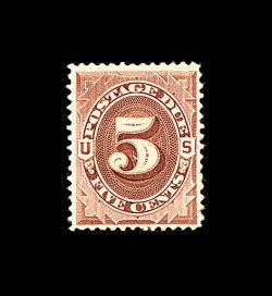 180 ng J11 image#J11, 5c Deep brown special printing, an impressive appearing unused example of this notoriously difficult rarity, being wonderfully well centered and far better than the vast majority of the small population of only 249 stamps that were issued, surrounded by full even perforations, fresh rich color and a razor-sharp impression, small thins and a couple of small edge tears, not detracting from the extremely fine appearance of a stamp that virtually never has a facial presentation as attractive as this; 1985 PF certificate. (Image) 9,250.00