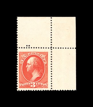 185 nh 214 image#214, 3c Vermilion, an eye-arresting top right corner sheet-margin example which possesses enormous jumbo margins, and being wonderfully well centered within this vast expanse, incredibly fresh, with truly radiant color and a prooflike impression on immaculate paper, pristine o.g., n.h., extremely fine; a remarkable stamp. (Image) 180.00