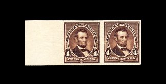 191 og 222a image#222a, 4c Dark brown imperforate, left sheet-margin horizontal pair, other margins large, strong rich color, o.g., lightly hinged, extremely fine; 1986 PF certificate. (Image) 210.00