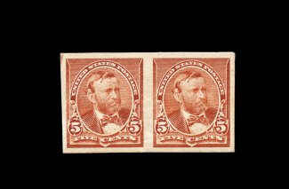 193 nh 223b image#223b, 5c Yellow brown, imperforate, horizontal pair, large even margins all around, a portion of the guide line arrow shows at top left, fresh, o.g., n.h., extremely fine. (Image) for hinged 225.00