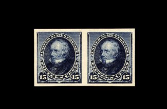 199 og 227a image#227a, 15c Indigo imperforate, horizontal pair, large even margins all around, deep intense color and impression, o.g., unhinged but with small gum skips, one of which causes a tiny natural thin spot (as often happens on these), extremely fine. (Image) 625.00