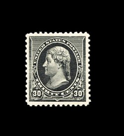 200 nh 228 image#228, 30c Black, a fabulous mint example that is the epitome of perfection, possessing exceptional overall physical attributes, including nearly perfect centering amid extravagantly wide margins, wonderfully bright and fresh, with prooflike color and impression, uniformly even and intact perforations all around, unblemished o.g., never hinged, extremely fine; a superb gem that is quite likely among the finest never hinged mint singles extant; 2003 PF certificate. (Image) 1,000.00