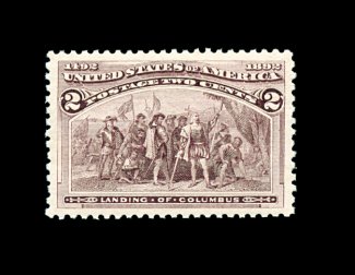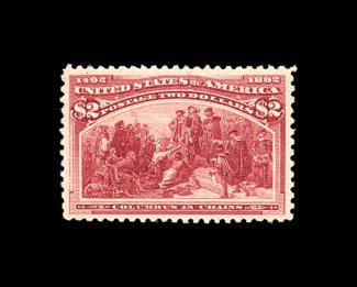 219 nh 242 image#242, $2.00 Columbian, a spectacular mint example that is beautifully centered within much larger margins than usually seen, deep luxuriant color with a finely detailed impression, this premium stamp is in a marvelous state of preservation, being extraordinarily fresh with full o.g. that is never hinged, extremely fine; a particularly challenging dollar value of the Columbian series to find in choice never hinged condition; 2002 PF certificate. (Image) 3,500.00