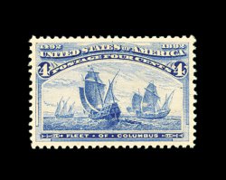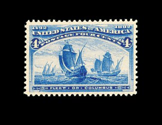 206 nh 233 image#233, 4c Columbian, a striking mint example which possesses incredibly intense color, so deep and luxuriant that it approaches the error of color shade, with a razor-sharp impression as well on brilliantly white paper, wonderfully well centered within very large margins, pristine o.g., n.h., an extremely fine gem for the collector who seeks stamps of extraordinary color and freshness; 1999 PF certificate for a vertical pair, this being the top stamp. (Image) 175.00