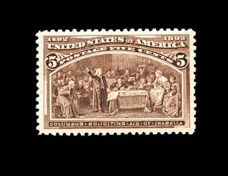 209 nh 234 image#234, 5c Columbian, an exceedingly choice mint single, being flawlessly centered amid uncharacteristically large margins, prooflike color and impression on bright fresh paper, o.g., n.h., extremely fine; a large-margined gem; 1987 PF certificate. (Image) 190.00