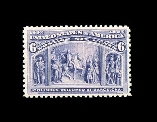 210 nh 235 image#235, 6c Columbian, an immaculate mint example, incredibly bright and fresh, outstanding centering within large margins, unblemished o.g., n.h., extremely fine; a gem for the most fastidious collector; 1997 PF certificate for a block of four, this being the top right stamp. (Image) 170.00