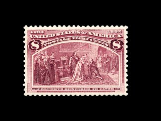 211 nh 236 image#236, 8c Columbian, outstanding centering within much larger margins than normally found on this value, sumptuously rich color and a crisp detailed impression, o.g., n.h., extremely fine gem; 1989 PF certificate for a block of four, this being the bottom left stamp, as well as a 2003 PSE certificate as a single. (Image) 150.00