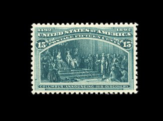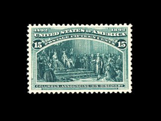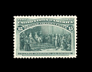 213 nh 238 image#238, 15c Columbian, an incredibly choice mint example in a true "post office" fresh state, gorgeous luxuriant color and a razor-sharp impression on pristine paper, marvelously well centered, unblemished o.g., never hinged, extremely fine gem; 2003 PF certificate. (Image) 500.00