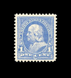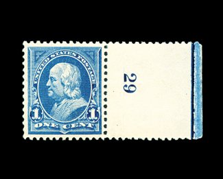 240 nh 264 image#264, 1c Blue, gem top sheet-margin partial imprint single, possessing incredibly intense color and impression, marvelously well centered and margined, o.g., n.h., extremely fine and striking; 1992 PF certificate for a strip of three, this being the left stamp. (Image) 14.00