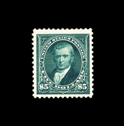 239 og 263 image#263, $5.00 Dark green, a phenomenal mint example of this popular and difficult high value, possessing margins of immense size that are most uncharacteristic and being incredibly well centered within them, sumptuously rich color in a deep shade, superbly detailed impression on wonderfully bright paper, full clean o.g., lightly hinged, extremely fine; this visually stunning gem surely ranks among the very finest in existence of this Bureau issue rarity; 2002 PF and PSE certificates. (Image) 5,000.00