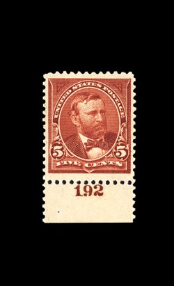 244 og 270 image#270, 5c Chocolate, bottom sheet-margin plate no. 192 single, extravagantly large and well balanced margins, deep luxuriant color, o.g., barest trace of hinging, extremely fine gem; 2002 PSE certificate. (Image) 37.50