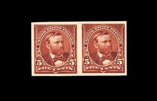 245 og 270b image#270b, 5c Chocolate, imperforate, horizontal pair, large margins all around, deeply rich color and impression, o.g., lightly hinged, extremely fine; 1992 PF certificate. (Image) 275.00