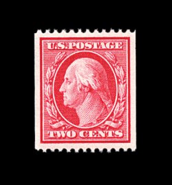 324 nh 349 image#349, 2c Carmine coil, perf. 12 horiz., gem mint single of this difficult coil, featuring wide and wonderfully well balanced margins all around, sumptuously rich color, unblemished o.g., n.h., extremely fine; certified premium quality examples of perf. 12 coil singles are a challenge to fine; photocopy of a 1994 PF certificate for a pair, this being the bottom stamp. (Image) 160.00