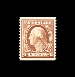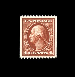 329 nh 354 image#354, 4c Orange brown coil, perf. 12 vert., a superb example of this scarce coil, flawlessly centered within extravagantly large margins, prooflike color and impression on immaculate paper, unblemished o.g., n.h., extremely fine; certified coil singles, especially in this gem quality, are true rarities; 1995 PSE certificate. (Image) 450.00