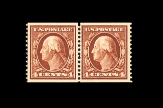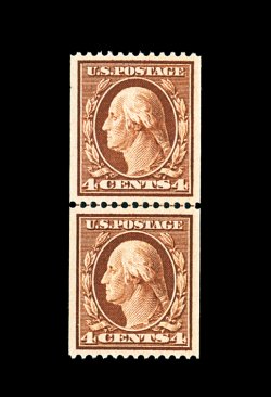 326 nh 350 image#350, 4c Orange brown coil, perf. 12 horiz., a sensational guide line pair in the finest attainable quality, as every aspect of this line pair simply could not be improved upon, possessing mathematically perfect centering amid extravagantly large margins (even at top and bottom of both stamps), incredibly intense color and impression that would rival any proof, plus the guide line is perfectly positioned between the two stamps, pristine o.g., n.h., superb; we feel quite confident in stating that this is the finest line pair of Scott #350 in existence; 2003 PF certificate. (Image) 2,600.00