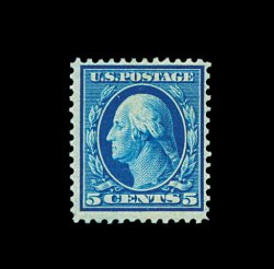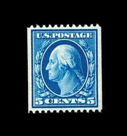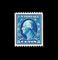 327 nh 351 image#351, 5c Blue coil, perf. 12 horiz., an extraordinary quality mint single, being in a condition that would be quite challenging to improve upon, featuring mathematically precise centering amid lavishly large margins which are most uncharacteristic of any of the perf. 12 coils, strikingly intense color and impression, pristine o.g., n.h., an extremely fine gem in every regard; 1999 PF certificate. (Image) 350.00
