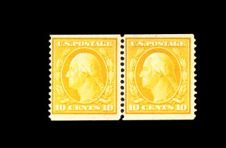 332 og 356 image#356, 10c Yellow coil, perf. 12 vert., attractive mint pair of this coil rarity, radiant color in a bright fresh shade, rather well centered, o.g., minute trace of a thin speck in right stamp not mentioned on accompanying certificate, otherwise fine-very fine; clear 1982 PF certificate. (Image) 6,750.00