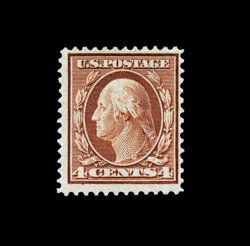 338 og 360 image#360, 4c Orange brown on bluish paper, a fresh and handsome example of this important 20th century rarity, deep luxuriant color and a strong well etched impression, rather well centered although reperforated at bottom (a number of existing copies have been reperforated on at least one side), full o.g., lightly hinged, nearly very fine appearance; a most representative example of a stamp whose entire population in private hands is less than 90 examples; clear 1957 PF certificate, as well as an updated 1999 PF certificate. (Image) 24,000.00