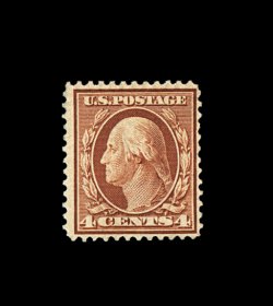 337 og 360 image#360, 4c Orange brown on bluish paper, extraordinarily fresh, luxuriously rich color and a deeply etched impression on crisp paper, while centered a bit to right it is actually better centered than most, full clean o.g. that has been relatively lightly hinged, very fine. A marvelously choice example of this important 20th century rarity, possessing far better centering and overall freshness than the vast majority of known examples. This value, along with the Eight Cent from the series, were never intended to be issued to the public. Approximately 90 of each were released in an exchange with the Post Office Department in Washington, D.C. to obtain other rarities for the nation's collection. An infrequent opportunity to acquire a handsome original gum Four Cent Bluish Paper. Accompanied by a 1969 PF certificate; ex-Keenan. (Image) 24,000.00