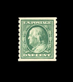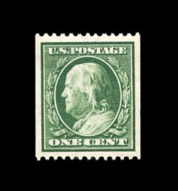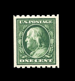 370 nh 385 image#385, 1c Green coil, perf. 12 horiz., a remarkable quality mint single, possessing lavishly large margins most uncharacteristic of this coil and being incredibly well centered within them, deep rich color and impression, unblemished o.g., n.h., extremely fine; a gem coil single; 1990 PF certificate for a pair, this being the top stamp. (Image) 80.00