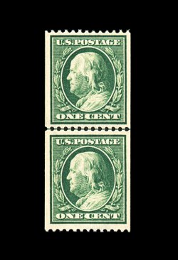 371 nh 385 image#385, 1c Green coil, perf. 12 horiz., an exceptional quality guide line pair, being in a condition not often encountered on this surprisingly difficult and often faked line pair, brilliantly fresh and crisp, wonderfully well centered within very large margins, prooflike color and impression on immaculate paper, unblemished o.g., n.h., extremely fine and especially desirable thus; 2003 PF certificate. (Image) 950.00