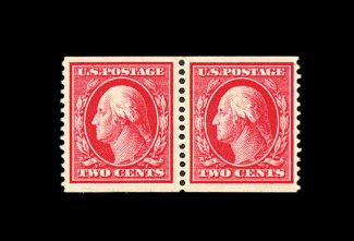 373 og 388 image#388, 2c Carmine coil, perf. 12 vert., an extraordinarily handsome and choice mint pair of this coil rarity, possessing 3mm spacing which provided each stamp in the pair with unusually wide margins and being quite well centered within them, strikingly intense color characteristic only to genuine examples, deeply etched impression on bright paper, o.g., lightly hinged, overall extremely fine for this notoriously challenging coil; 2003 PF certificate. (Image) 3,500.00