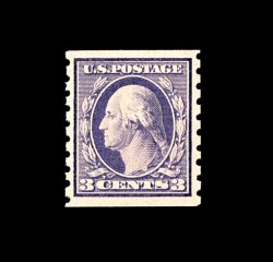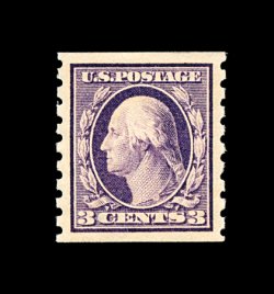 379 nh 394 image#394, 3c Deep violet coil, perf. 8 1/2 vert., a stunning mint single in a condition that simply cannot be improved upon, featuring mathematically precise centering amid lavishly large margins, sumptuously rich color and impression on crisp paper, immaculate o.g., n.h., a superb gem for the perfectionist. (Image) 115.00