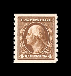 381 nh 395 image#395, 4c Brown coil, perf. 8 1/2 vert., extraordinary quality mint coil single, incredibly well centered amid huge jumbo margins, rich luxuriant color and a deeply etched impression, o.g., n.h., extremely fine; a large-margined gem; 1992 PF certificate for a strip of four from which this stamp was taken; ex-Morris. (Image) 120.00