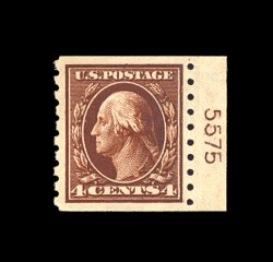382 nh 395 image#395, 4c Brown coil, perf. 8 1/2 vert., right sheet-margin plate no. 5575 single, wonderfully fresh and choice, outstanding centering, strong rich color, o.g., n.h., extremely fine; plate number coils are quite elusive and highly collectable; 1998 PF certificate. (Image) 120.00+