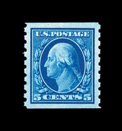 383 nh 396 image#396, 5c Blue coil, perf. 8 1/2 vert., an incomparable quality mint example, featuring absolutely perfect centering amid extravagantly large margins which are most uncommon, strikingly intense color in a deep shade, plus its perforations on both sides are completely intact (a seldom seen occurrence on perf. 8 1/2 coils), immaculate o.g., n.h., extremely fine; a superb gem for the most fastidious collector; 1996 PF certificate. (Image) 115.00