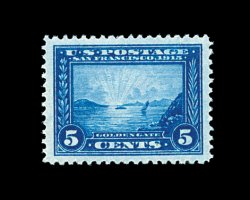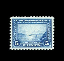 393 nh 403 image#403, 5c Panama-Pacific, perf. 10, incredibly well centered within uncharacteristically lavish margins, sharp detailed impression in a bright clear blue shade, pristine o.g., n.h., extremely fine; a surprisingly difficult stamp to find in this never hinged gem condition; 1996 PF certificate. (Image) 350.00