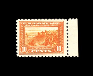 394 nh 404 image#404, 10c Panama-Pacific, perf. 10, an exceedingly choice right sheet-margin single, beautifully centered within extravagantly large margins, brilliant rich color emphasizes the sharp impression, o.g., n.h., extremely fine; an exceptionally difficult stamp to find both centered and never hinged; 2001 PF certificate. (Image) 1,750.00
