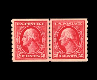 401 nh 413 image#413, 2c Carmine coil, Ty. I, perf. 8 1/2 vert., highly select guide line pair, extraordinarily well centered within large margins, perfectly positioned guide line between the two stamps, gorgeous intense color, o.g., n.h., extremely fine. (Image) 550.00