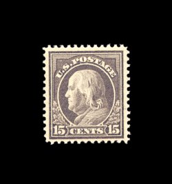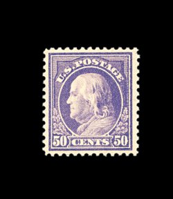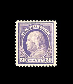 414 nh 422 image#422, 50c Violet, double line watermark, a fabulous quality mint example, possessing several exceptional physical attributes, not the least of which is its spectacular overall freshness, with truly prooflike color and impression on brilliantly white paper, marvelously well centered within considerably larger margins than usual, pristine o.g. without a single gum bend or skip, n.h., extremely fine gem; one of the finest never hinged #422's we have ever offered; 2001 PF certificate. (Image) 525.00