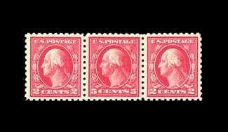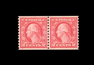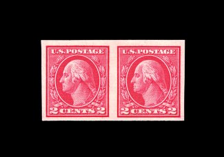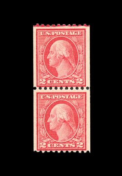 451 og 459 image#459, 2c Carmine imperforate coil, pair, large margins all around, rich color, o.g., lightly hinged, extremely fine; 2000 PSE certificate. (Image) 475.00