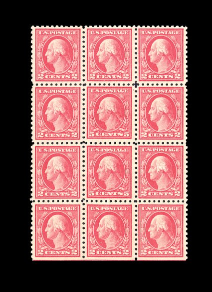 458 ogbl 467 #467, 5c Carmine error, double error, the center pair in a mint block of twelve, quite well centered, especially bright color, o.g. which has been just slightly sweated to remove traces of hinging, very fine. (Image) 1,800.00