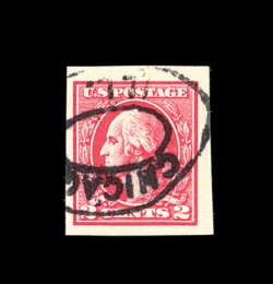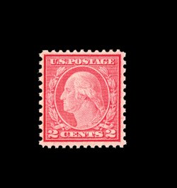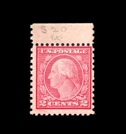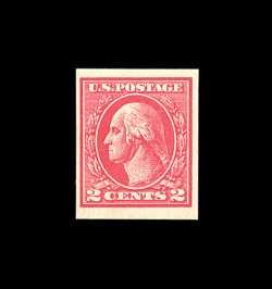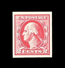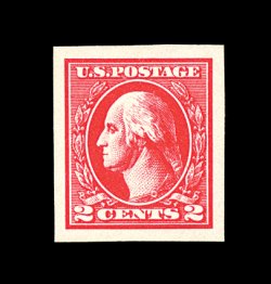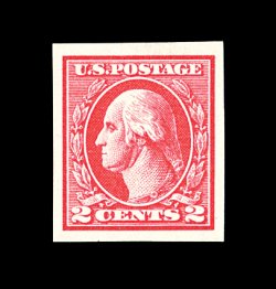 512 nh 534B image#534B, 2c Carmine offset imperforate, Ty. VII, pristine mint example of this truly rare 20th century stamp, featuring especially bright color on immaculate paper, four large to extra-large margins, o.g., n.h., choice very fine; seldom encountered both in premium condition and never hinged; 2002 PSE certificate. (Image) 3,600.00
