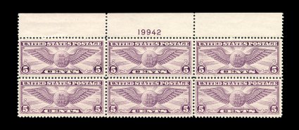 570 nhPB C12 image#C12, 5c Violet, premium quality full top margin plate no. 19942 block of six, wonderfully bright and fresh, well centered, o.g., n.h., extremely fine. (Image) 190.00
