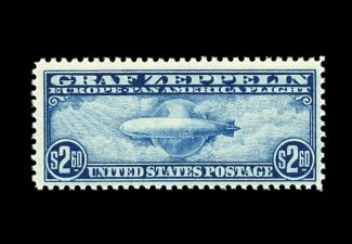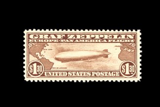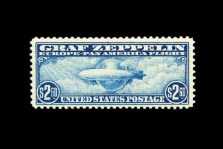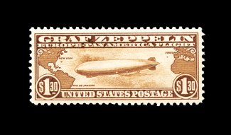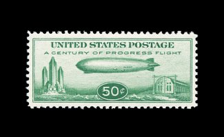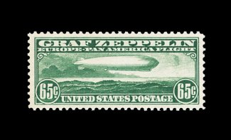 580 nh C18 image#C18, 50c Graf Zeppelin, gem mint example, possessing mathematically precise centering and uncharacteristically large margins, immaculate o.g. without a single gum bend or skip, n.h., extremely fine; clearly not your typical quality #C18. (Image) 100.00
