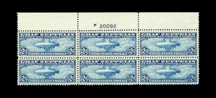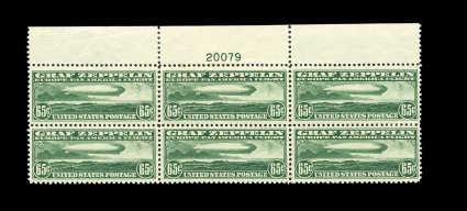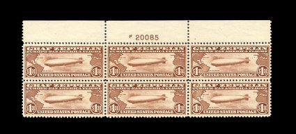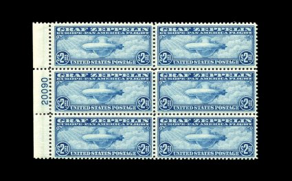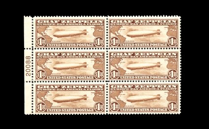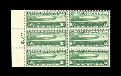 573 nhPB C13-15 image#C13-15, 65c-$2.60 Graf Zeppelins cplt., full top margin plate number blocks of six, well centered throughout, strong rich colors, o.g., n.h., 65c with small bits of excess gum on face, $1.30 with small gum crease at bottom left corner, $2.60 with tiny perf. disc on gum, a very fine and well-matched set of these popular plate blocks. (image 573a) (image 573b) (Image) 22,100.00