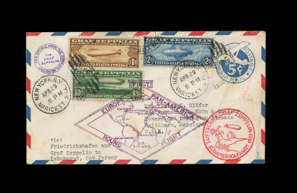575 c C13-15 image#C13-15, 65c-$2.60 Graf Zeppelins cplt., all tied to a flown 5c Entire by Apr 29, 1930 Varick Station pmks., 65c also tied by purple cachet, $2.60 with small bit of red cancel, proper cachets and backstamps including the round trip cachet at top left, some small cover faults including light toning that affects the 65c stamp, stamps with very fine centering; scarce to find all three values on one cover making the full round trip. (Image) 1,135.00+