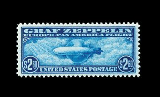 579 nh C15 image#C15, $2.60 Graf Zeppelin, a gem mint example that would please even the most demanding condition conscious collector, being incredibly well centered amid lavishly large margins, plus this stamp possesses a remarkable overall brilliance and crispness, deep luxuriant color, unblemished o.g. without a single gum bend or skip, n.h., extremely fine; 1998 PF certificate. (Image) 1,050.00
