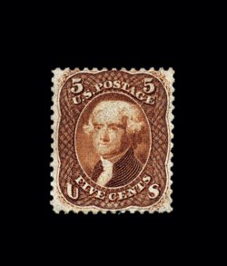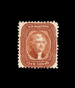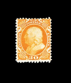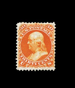55 og 61 image#61, 30c Red orange "August", full clean original gum, fabulously bright and crisp, featuring spectacular eye-arresting color in a very deep shade, wonderfully well centered and margined, with its perforations clearing the design all around, which is exceedingly difficult to find on this tightly spaced stamp, completely free of any of the flaws which affect most known examples, extremely fine. There are only 29 certified examples of Scott #61 found in the Philatelic Foundation records, plus there is an additional uncertified example in the New York Public Library collection. One common characteristic of the Thirty Cent "August" is the presence of creasing due to the brittle nature of the paper. In many cases this creasing is severe and is an accepted condition factor for serious collectors attempting to assemble a complete set of "August" issues. To find one without this characteristic creasing is extraordinary. To then find one still retaining its full original gum and possessing outstanding centering is a virtually unique opportunity. A superlative example of this important rarity. Ranking as one of the very finest Thirty Cent "August" issues in existence. Accompanied by 1970 and 2002 PF certificates; ex-Lessin. (Image) 25,000.00